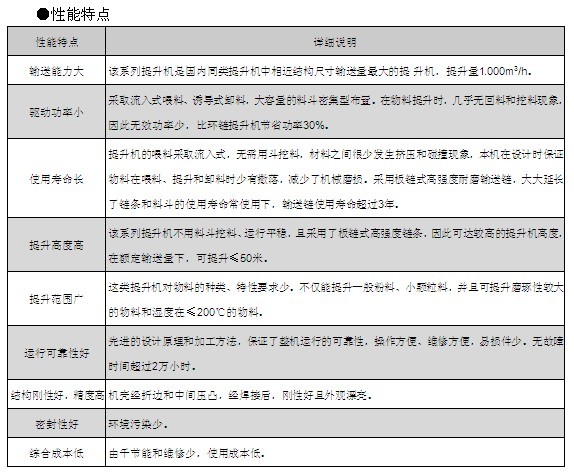 3、驅動功率小。采取流入式喂料、誘導式卸料,大容量的料斗密集型布置。在物料提升時幾乎無回料和挖料現(xiàn)象,因此比環(huán)鏈提升機節(jié)省功率30%。